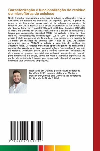 Neste trabalho foi avaliada a influência da adição de diferentes teores e tamanhos de resíduo de celulósico de algodão, gerado a partir do processo de lixamento, como material de reforço em matrizes de cimento CPP Classe Especial para poços de petróleo. A funcionalização da fibra foi feita com o polieletrólito poli dialil dimetil amônio (PDDACl). A matriz de cimento foi avaliada utilizando-se o ensaio de resistência à tração por compressão diametral (TCD). Foi avaliado o tipo da fibra: crua ou funcionalizada; concentração: 0,5 e 1,0% e granulometria: grosso (retido em peneira de 14 mesh) e fino (passante em peneira de 28 mesh) em matrizes de cimento com 7 dias de cura. As análises apontaram que o PDDACl se aderiu a superfície do resíduo por adsorção física. Os ensaios mecânicos apontam ganho de resistência à compressão associado ao teor, concentração e funcionalização ou não do resíduo. Conclui-se então, que o resíduo celulósico funcionalizado demonstra um grande potencial para aplicação em pastas de cimento para cimentação de poços, tendo em vista o aumento significativo no ganho de resistência à tração por compressão diametral, mesmo com um baixo teor do resíduo empregado.