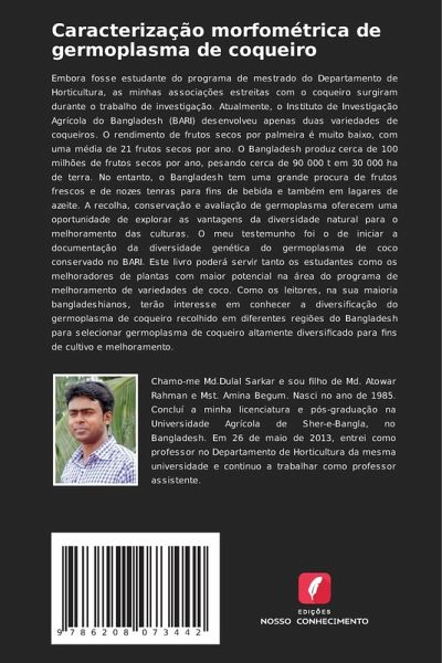 Embora fosse estudante do programa de mestrado do Departamento de Horticultura, as minhas associações estreitas com o coqueiro surgiram durante o trabalho de investigação. Atualmente, o Instituto de Investigação Agrícola do Bangladesh (BARI) desenvolveu apenas duas variedades de coqueiros. O rendimento de frutos secos por palmeira é muito baixo, com uma média de 21 frutos secos por ano. O Bangladesh produz cerca de 100 milhões de frutos secos por ano, pesando cerca de 90 000 t em 30 000 ha de terra. No entanto, o Bangladesh tem uma grande procura de frutos frescos e de nozes tenras para fins de bebida e também em lagares de azeite. A recolha, conservação e avaliação de germoplasma oferecem uma oportunidade de explorar as vantagens da diversidade natural para o melhoramento das culturas. O meu testemunho foi o de iniciar a documentação da diversidade genética do germoplasma de coco conservado no BARI. Este livro poderá servir tanto os estudantes como os melhoradores de plantas com maior potencial na área do programa de melhoramento de variedades de coco. Como os leitores, na sua maioria bangladeshianos, terão interesse em conhecer a diversificação do germoplasma de coqueiro recolhido em diferentes regiões do Bangladesh para selecionar germoplasma de coqueiro altamente diversificado para fins de cultivo e melhoramento.