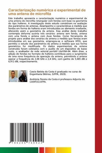 Este trabalho apresenta a caracterização numérica e experimental de uma antena de microfita retangular com fendas com base na geometria do tipo halteres. A investigação deste estudo consistiram na avaliação dos parâmetros de antenas, desempenho e características à medida que fendas em forma de halteres eram introduzidas ao elemento irradiante, alterando assim a geometria da antena. Essa análise deste trabalho contempla deforma sucinta três cenários: antena sem fenda, antena com uma fenda e antena com duas fendas. Como ferramenta de projeto para análise dos cenários da antena a medida que fendas eram introduzidas em sua geometria, empregou-se o software HFSS, que permitiu o estudo dos parâmetros da antena à medida que sua forma geométrica foi modificada. Os dados experimentais da antena construída foram coletados com o auxílio de um dispositivo de baixo custo, o analisador de rede vetorial portátil LiteVNA-64. Além disso, a adição de fendas no formato de halteres contribuiu para o surgimento de uma nova frequência de operação da antena, permitindo a antena operar a frequência de 2,06 GHz e 2,4 GHz, com ganho de 5,665 dBi e 6,912 dBi, respectivamente.