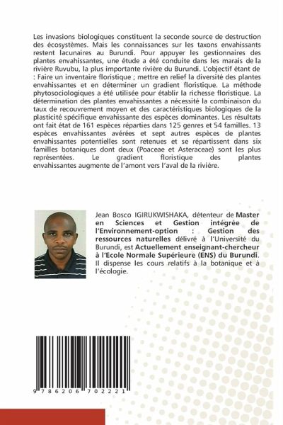 Les invasions biologiques constituent la seconde source de destruction des écosystèmes. Mais les connaissances sur les taxons envahissants restent lacunaires au Burundi. Pour appuyer les gestionnaires des plantes envahissantes, une étude a été conduite dans les marais de la rivière Ruvubu, la plus importante rivière du Burundi. L'objectif étant de : Faire un inventaire floristique ; mettre en relief la diversité des plantes envahissantes et en déterminer un gradient floristique. La méthode phytosociologiques a été utilisée pour établir la richesse floristique. La détermination des plantes envahissantes a nécessité la combinaison du taux de recouvrement moyen et des caractéristiques biologiques de la plasticité spécifique envahissante des espèces dominantes. Les résultats ont fait état de 161 espèces réparties dans 125 genres et 54 familles. 13 espèces envahissantes avérées et sept autres espèces de plantes envahissantes potentielles sont retenues et se répartissent dans six familles botaniques dont deux (Poaceae et Asteraceae) sont les plus représentées. Le gradient floristique des plantes envahissantes augmente de l'amont vers l'aval de la rivière.