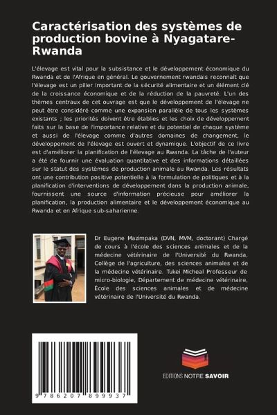 L'élevage est vital pour la subsistance et le développement économique du Rwanda et de l'Afrique en général. Le gouvernement rwandais reconnaît que l'élevage est un pilier important de la sécurité alimentaire et un élément clé de la croissance économique et de la réduction de la pauvreté. L'un des thèmes centraux de cet ouvrage est que le développement de l'élevage ne peut être considéré comme une expansion parallèle de tous les systèmes existants ; les priorités doivent être établies et les choix de développement faits sur la base de l'importance relative et du potentiel de chaque système et aussi de l'élevage comme d'autres domaines de changement, le développement de l'élevage est ouvert et dynamique. L'objectif de ce livre est d'améliorer la planification de l'élevage au Rwanda. La tâche de l'auteur a été de fournir une évaluation quantitative et des informations détaillées sur le statut des systèmes de production animale au Rwanda. Les résultats ont une contribution positive potentielle à la formulation de politiques et à la planification d'interventions de développement dans la production animale, fournissent une source d'information précieuse pour améliorer la planification, la production alimentaire et le développement économique au Rwanda et en Afrique sub-saharienne.