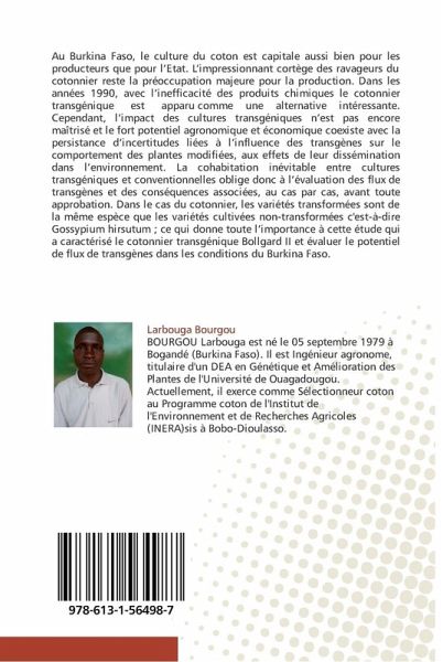 Au Burkina Faso, le culture du coton est capitale aussi bien pour les producteurs que pour l'Etat. L'impressionnant cortège des ravageurs du cotonnier reste la préoccupation majeure pour la production. Dans les années 1990, avec l'inefficacité des produits chimiques le cotonnier transgénique est apparu comme une alternative intéressante. Cependant, l'impact des cultures transgéniques n'est pas encore maîtrisé et le fort potentiel agronomique et économique coexiste avec la persistance d'incertitudes liées à l'influence des transgènes sur le comportement des plantes modifiées, aux effets de leur dissémination dans l'environnement. La cohabitation inévitable entre cultures transgéniques et conventionnelles oblige donc à l'évaluation des flux de transgènes et des conséquences associées, au cas par cas, avant toute approbation. Dans le cas du cotonnier, les variétés transformées sont de la même espèce que les variétés cultivées non-transformées c'est-à-dire Gossypium hirsutum ; ce qui donne toute l'importance à cette étude qui a caractérisé le cotonnier transgénique Bollgard II et évaluer le potentiel de flux de transgènes dans les conditions du Burkina Faso.