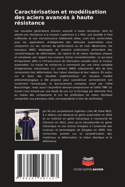 Les nouvelles générations d'aciers avancés à haute résistance, dont on attend une résistance à la traction supérieure à 1 GPa, une ductilité à froid suffisante et une microstructure faiblement alliée, sont très recherchées pour les applications d'allègement des véhicules automobiles sans compromis sur les normes de performance ou de coût. Néanmoins, les nouveaux AHSS développés de manière préliminaire présentent des caractéristiques de déformation, de rupture et de retour élastique uniques et complexes par rapport aux nuances d'acier conventionnelles, ce qui pose d'importants défis à l'infrastructure de fabrication actuelle dans le secteur automobile. Ce travail de recherche a commencé par une série complète d'expériences mécaniques sur certains AHSS sélectionnés afin de bien comprendre leur déformation, leur retour élastique et leur rupture. En outre, sur la base des résultats expérimentaux, un nouveau modèle phénoménologique a été proposé pour caractériser correctement non seulement l'anisotropie, le durcissement complexe induit par l'effet Bauschinger, mais aussi l'asymétrie tension-compression et l'effet TRIP. Ce travail s'est achevé par une étude de cas sur le formage par éléments finis au niveau des composants et sur les prédictions de retour élastique comparées aux panneaux réels correspondants à titre de vérification.