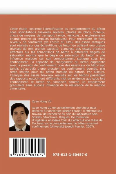 Cette étude concerne l'identification du comportement du béton sous sollicitations triaxiales sévères (chutes de blocs rocheux, chocs de moyens de transport (avion, véhicule...), explosions en champ proche ou impacts balistiques). Pour reproduire de forts niveaux de contrainte (de l'ordre du GPa), des essais statiques sont réalisés sur des échantillons de béton en utilisant une presse triaxiale de très grande capacité. L'analyse des essais triaxiaux effectués sur les échantillons de béton à différents degrés de saturation montre que le degré de saturation du béton a une influence majeure sur son comportement statique sous fort confinement. La capacité de chargement du béton augmente avec la pression de confinement pour des essais sur du béton sec tandis qu'au-delà d'une pression de confinement donnée, elle reste limitée pour du béton humide ou saturé. Par ailleurs, l'analyse des essais triaxiaux réalisés sur les bétons possédant des rapports eau/ciment différents met en évidence que sous fort confinement, le béton se comporte comme un empilement granulaire sans aucune influence de la résistance de la matrice cimentaire.