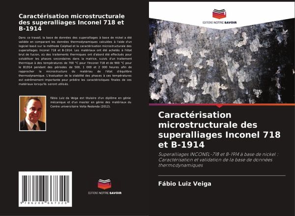 Dans ce travail, la base de données des superalliages à base de nickel a été validée en comparant les données thermodynamiques calculées à l'aide d'un logiciel basé sur la méthode Calphad et la caractérisation microstructurale des superalliages Inconel 718 et B-1914. Les matériaux ont été achetés à l'état brut de fusion, où des traitements thermiques ont d'abord été effectués pour solubiliser les phases secondaires dans la matrice, suivis d'un traitement thermique à des températures de 700 °C pour l'Inconel 718 et de 900 °C pour le B1914 pendant des périodes de 500, 1 000 et 2 000 heures afin de rapprocher la microstructure du matériau de l'état d'équilibre thermodynamique. L'évaluation de la stabilité des phases à ces températures est extrêmement importante pour prédire les caractéristiques finales de ces matériaux lorsqu'ils seront utilisés.