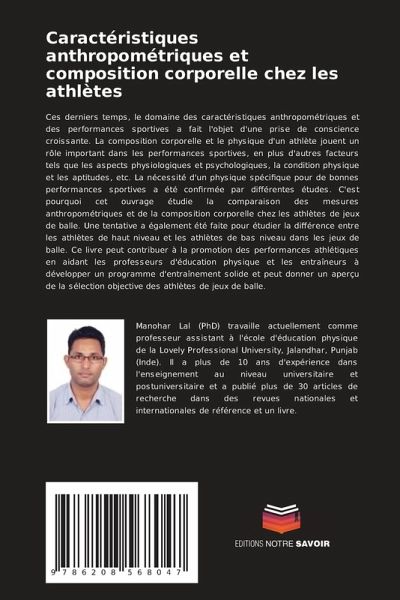 Ces derniers temps, le domaine des caractéristiques anthropométriques et des performances sportives a fait l'objet d'une prise de conscience croissante. La composition corporelle et le physique d'un athlète jouent un rôle important dans les performances sportives, en plus d'autres facteurs tels que les aspects physiologiques et psychologiques, la condition physique et les aptitudes, etc. La nécessité d'un physique spécifique pour de bonnes performances sportives a été confirmée par différentes études. C'est pourquoi cet ouvrage étudie la comparaison des mesures anthropométriques et de la composition corporelle chez les athlètes de jeux de balle. Une tentative a également été faite pour étudier la différence entre les athlètes de haut niveau et les athlètes de bas niveau dans les jeux de balle. Ce livre peut contribuer à la promotion des performances athlétiques en aidant les professeurs d'éducation physique et les entraîneurs à développer un programme d'entraînement solide et peut donner un aperçu de la sélection objective des athlètes de jeux de balle.