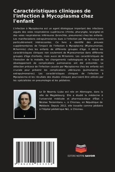 L'infection à Mycoplasma est un agent étiologique important des infections aiguës des voies respiratoires supérieures (rhinite, pharyngite, laryngite) et des voies respiratoires inférieures (bronchite, pneumonie) chez les enfants. Les manifestations extrapulmonaires dues à l'infection par Mycoplasma sont particulièrement intéressantes. Ce livre a identifié des preuves supplémentaires de l'impact de l'infection à Mycoplasma (M.pneumoniae, M.hominis) chez les enfants de différents groupes d'âge. Il décrit les caractéristiques cliniques non seulement de M.pneumoniae dans différents groupes d'âge d'enfants, mais aussi de M.hominis. Les caractéristiques de l'évolution de la maladie, les changements radiologiques et le risque de développement de complications pulmonaires ont été présentés. La détection précoce de l'infection causée par Mycoplasma chez les enfants est cruciale pour prévenir les complications ultérieures (pulmonaires ou extrapulmonaires). Les caractéristiques cliniques de l'infection à Mycoplasma et les résultats des études cliniques pourraient être utilisés par les spécialistes en pneumologie et les pédiatres.