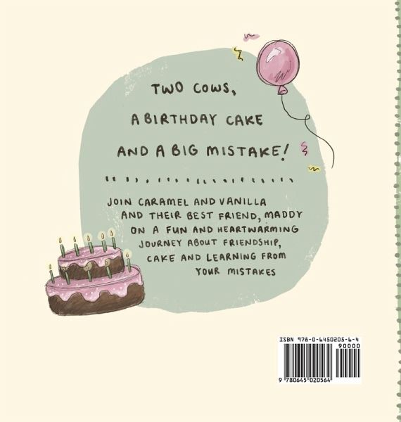 Two cows, a birthday cake and a BIG mistake! Join Caramel and Vanilla and their human best friend, Maddy on a fun and heartwarming journey about cake and friendship (but it's mostly about cake). Learn with Caramel and Vanilla about how eating your best friend's cake can have some pretty difficult consequences but it's never too late to find a way to fix your mistakes. A beautifully illustrated story that the whole family will want to read again and again!