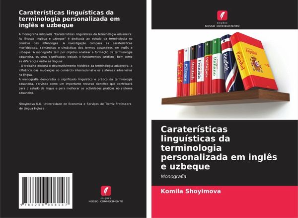 A monografia intitulada "Caraterísticas linguísticas da terminologia aduaneira: As línguas inglesa e uzbeque" é dedicada ao estudo da terminologia no domínio das alfândegas. A investigação compara as caraterísticas morfológicas, semânticas e sintácticas dos termos aduaneiros em inglês e uzbeque. A monografia tem por objetivo analisar a formação da terminologia aduaneira, os seus significados lexicais e fundamentos jurídicos, bem como as diferenças entre as línguas. O trabalho explora o desenvolvimento histórico da terminologia aduaneira, a influência das mudanças no comércio internacional e os sistemas aduaneiros na língua.A monografia demonstra o significado linguístico e prático da terminologia aduaneira, servindo como um importante recurso científico que contribuirá para o estudo da língua e para melhorar as actividades práticas no sistema aduaneiro.
