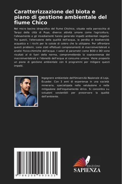 Nel micro bacino idrografico del fiume Chichico, situato nella parrocchia di Tarqui della città di Puyo, diverse attività umane come l'agricoltura, l'allevamento e gli insediamenti hanno generato impatti ambientali negativi. Tra questi, l'alterazione della qualità dell'acqua, la perdita di biodiversità acquatica e i rischi per la salute di coloro che la utilizzano. Per affrontare questi problemi, sono stati effettuati campionamenti di macroinvertebrati e analisi fisico-chimiche dell'acqua. I valori di parametri come BOD e DO sono risultati al di fuori della norma, compromettendo la sopravvivenza dei macroinvertebrati e l'idoneità dell'acqua al consumo umano. Viene proposto un piano di gestione ambientale con 6 programmi per mitigare questi impatti.