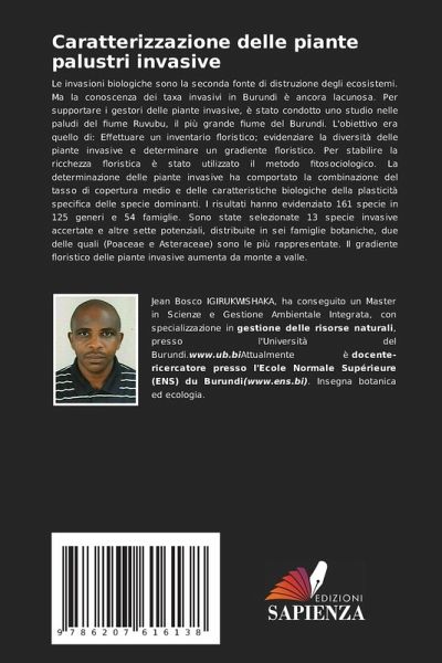 Le invasioni biologiche sono la seconda fonte di distruzione degli ecosistemi. Ma la conoscenza dei taxa invasivi in Burundi è ancora lacunosa. Per supportare i gestori delle piante invasive, è stato condotto uno studio nelle paludi del fiume Ruvubu, il più grande fiume del Burundi. L'obiettivo era quello di: Effettuare un inventario floristico; evidenziare la diversità delle piante invasive e determinare un gradiente floristico. Per stabilire la ricchezza floristica è stato utilizzato il metodo fitosociologico. La determinazione delle piante invasive ha comportato la combinazione del tasso di copertura medio e delle caratteristiche biologiche della plasticità specifica delle specie dominanti. I risultati hanno evidenziato 161 specie in 125 generi e 54 famiglie. Sono state selezionate 13 specie invasive accertate e altre sette potenziali, distribuite in sei famiglie botaniche, due delle quali (Poaceae e Asteraceae) sono le più rappresentate. Il gradiente floristico delle piante invasive aumenta da monte a valle.