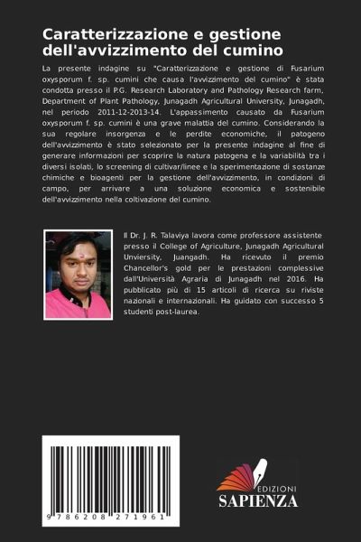 La presente indagine su "Caratterizzazione e gestione di Fusarium oxysporum f. sp. cumini che causa l'avvizzimento del cumino" è stata condotta presso il P.G. Research Laboratory and Pathology Research farm, Department of Plant Pathology, Junagadh Agricultural University, Junagadh, nel periodo 2011-12-2013-14. L'appassimento causato da Fusarium oxysporum f. sp. cumini è una grave malattia del cumino. Considerando la sua regolare insorgenza e le perdite economiche, il patogeno dell'avvizzimento è stato selezionato per la presente indagine al fine di generare informazioni per scoprire la natura patogena e la variabilità tra i diversi isolati, lo screening di cultivar/linee e la sperimentazione di sostanze chimiche e bioagenti per la gestione dell'avvizzimento, in condizioni di campo, per arrivare a una soluzione economica e sostenibile dell'avvizzimento nella coltivazione del cumino.