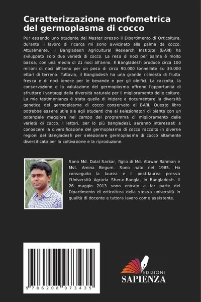 Pur essendo uno studente del Master presso il Dipartimento di Orticoltura, durante il lavoro di ricerca mi sono avvicinato alla palma da cocco. Attualmente, il Bangladesh Agricultural Research Institute (BARI) ha sviluppato solo due varietà di cocco. La resa di noci per palma è molto bassa, con una media di 21 noci all'anno. Il Bangladesh produce circa 100 milioni di noci all'anno per un peso di circa 90.000 tonnellate su 30.000 ettari di terreno. Tuttavia, il Bangladesh ha una grande richiesta di frutta fresca e di noci tenere per le bevande e per gli oleifici. La raccolta, la conservazione e la valutazione del germoplasma offrono l'opportunità di sfruttare i vantaggi della diversità naturale per il miglioramento delle colture. La mia testimonianza è stata quella di iniziare a documentare la diversità genetica del germoplasma di cocco conservato al BARI. Questo libro potrebbe essere utile sia agli studenti che ai selezionatori di piante con un potenziale maggiore nel campo del programma di miglioramento delle varietà di cocco. I lettori, per lo più bangladesi, saranno interessati a conoscere la diversificazione del germoplasma di cocco raccolto in diverse regioni del Bangladesh per selezionare germoplasma di cocco altamente diversificato per la coltivazione e la riproduzione.