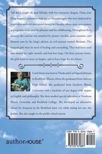 Tall sky, a bright elf, and Melody, with her miniature dragon, Daisy, join King Aryante's caravan to help rescue Aksandan girls who were abducted by bitter elves and sold into sexual slavery in Orendia, where men view women as properties to be used for pleasure and for childbearing. Throughout their journey, the caravan was attacked by pirates, bandits, giant mantises, and demons sent by the king's adviser, an evil sorcerer named Ahriman. The rescued girls were in need of healing and counseling. They had been used and abused for eight months and had lost hope. On their journey home, the girls learn to trust, to forgive, and to have hope for the future.