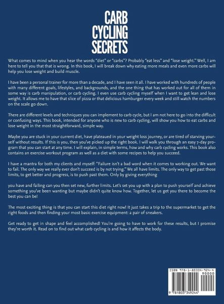 What comes to mind when you hear the words "diet" or "carbs"? Your Customers Will Never Stop To Use This Amazing Cookbook! Probably "eat less" and "lose weight." Well, I am here to tell you that that is wrong. In this book, I will break down why eating more meals and even more carbs will help you lose weight and build muscle. I have been a personal trainer for more than a decade, and I have seen it all. I have worked with hundreds of people with many different goals, lifestyles, and backgrounds, and the one thing that has worked out for all of them in some way is carb manipulation, or carb cycling. I even use carb cycling myself when I want to get lean and lose weight. It allows me to have that slice of pizza or that delicious hamburger every week and still watch the numbers on the scale go down. There different levels and techniques you can implement to carb cycle, but I am not here to go into the difficult or confusing ways. This book, intended for anyone who is new to carb cycling, will show you how to eat carbs and lose weight in the most straightforward, simple way. Maybe you are stuck in your current diet, have plateaued in your weight loss journey, or are tired of starving yourself without results. If this is you, then you've picked up the right book. I will walk you through an easy 7-day program that you can start at any time. I will explain, in simple terms, how and why carb cycling works. This book also contains an exercise workout program as well as a diet with some recipes to help you succeed. I have a mantra for both my clients and myself: "Failure isn't a bad word when it comes to working out. We want to fail. The only way we really ever don't succeed is by not trying." We all have limits. The only way to get past those limits, to get better and progress, is to push past them. Only by giving everything you have and failing can you then set new, further limits. Let's set you up with a plan to push yourself and achieve something you've been wanting but maybe didn't quite know how. Together, let us get you there to become the best you can be! The most exciting thing is that you can start this diet right now! It just takes a trip to the supermarket to get the right foods and then finding your most basic exercise equipment: a pair of sneakers. Get ready to get in shape and feel accomplished! You're going to have to work for these results, but I promise they're worth it. Read on to find out what carb cycling is and how it affects the body. Buy it NOW and let your customers get addicted to this amazing book!