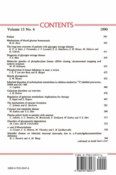 Preface.- Mechanisms of Blood Glucose Homeostasis.- The Long-term Outcome of Patients with Glycogen Storage Diseases.- Diagnosis of Glycogen Storage Disease.- Molecular Genetics of Phosphorylase Kinase: cDNA Cloning, Chromosomal Mapping and Isoform Structure.- Phosphorylase b Kinase Deficiency in Man: a Review.- Muscle Glycogenosis.- Inherited Disorders of Carbohydrate Metabolism in Children Studied by 13C-Labelled Precursors, NMR and GC-MS.- Galactose Disorders: an Overview.- Regulation of Galactose Metabolism: Implications for Therapy.- The Mechanisms of Cataract Formation.- Cataract and Metabolic Disease.- Plasma Polyol Levels in Patients with Cataract.- Disorders of Glycoprotein Degradation.- ?- and ?- Mannosidoses.- Schindler Disease: an Inherited Neuroaxonal Dystrophy due to ?-N-Acetylgalactosaminidase Deficiency.- Advances in the Molecular Genetics of Metachromatic Leukodystrophy.- Displacement Bone Marrow Transplantation for Some Inborn Errors.- Clinical Application of Somatic Gene Therapy in Inborn Errors of Metabolism.- Transport of Amino Acids by the Human Placenta: Predicted Effects thereon of Maternal Hyperphenylalaninaemia.- Transport of Amino Acids across the Blood-Brain Barrier: Implications for Treatment of Maternal Phenylketonuria.- The Effects of High Phenylalanine Concentration on Chick Embryonic Development.- A Preliminary Report of the Collaborative Study of Maternal Phenylketonuria in the United States and Canada.- Fetal Damage due to Maternal Phenylketonuria: Effects of Dietary Treatment and Maternal Phenylalanine Concentrations around the Time of Conception.- Maternal Phenylketonuria - the Irish Experience.- Cognitive Development in Offspring of Untreated and Preconceptionally Treated Maternal Phenylketonuria.