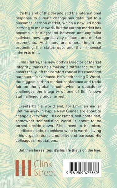It's the end of the decade and the international response to climate change has defaulted to a piecemeal carbon market, which a new UN body is trying to make work. But the carbon market has become a battleground between anti-capitalist activists, now aggressively militant, and market proponents. And there are others, intent on protecting the status quo, and their financial interests in it. Emil Pfeffer, the new body's Director of Market Integrity, thinks he's making a difference, but he hasn't really left the comfort zone of his cocooned bureaucrat's existence. He's addressing C-World, the biggest carbon market conference and trade fair on the global circuit, when a questioner challenges the integrity of one of Emil's own staff, allegedly under arrest. Events half a world and, for Emil, an earlier lifetime away in Papua New Guinea are about to change everything. His cosseted, self-contained, somewhat self-satisfied world is about to be turned upside down. Risks need to be taken, sacrifices made, to achieve what is worth saving - his organisation's credibility and purpose. His colleagues' reputations. But then he realizes, it's his life that's on the line.