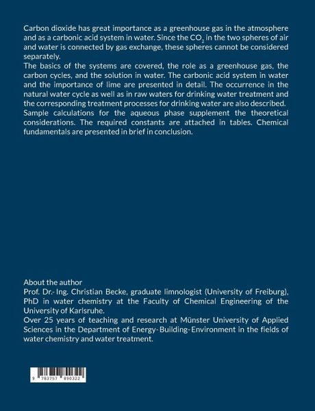 Carbon dioxide has great importance as a greenhouse gas in the atmosphere and as a carbonic acid system in water. Since the CO2 in the two spheres of air and water is connected by gas exchange, these spheres cannot be considered separately. The basics of the systems are covered, the role as a greenhouse gas, the carbon cycles, and the solution in water. The carbonic acid system in water and the importance of lime are presented in detail. The occurrence in the natural water cycle as well as in raw waters for drinking water treatment and the corresponding treatment processes for drinking water are also described.Sample calculations for the aqueous phase supplement the theoretical considerations. The required constants are attached in tables. Chemical fundamentals are presented in brief in conclusion.