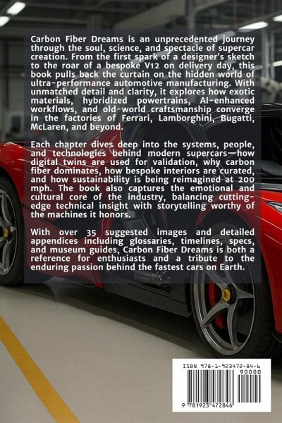 Carbon Fiber Dreams is an unprecedented journey through the soul, science, and spectacle of supercar creation. From the first spark of a designer's sketch to the roar of a bespoke V12 on delivery day, this book pulls back the curtain on the hidden world of ultra-performance automotive manufacturing. With unmatched detail and clarity, it explores how exotic materials, hybridized powertrains, AI-enhanced workflows, and old-world craftsmanship converge in the factories of Ferrari, Lamborghini, Bugatti, McLaren, and beyond. Each chapter dives deep into the systems, people, and technologies behind modern supercars-how digital twins are used for validation, why carbon fiber dominates, how bespoke interiors are curated, and how sustainability is being reimagined at 200 mph. The book also captures the emotional and cultural core of the industry, balancing cutting-edge technical insight with storytelling worthy of the machines it honors. With over 35 suggested images and detailed appendices including glossaries, timelines, specs, and museum guides, Carbon Fiber Dreams is both a reference for enthusiasts and a tribute to the enduring passion behind the fastest cars on Earth.