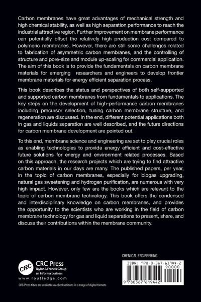 Carbon membranes have great advantages of strong mechanical strength and high chemical stabilities, as well as high separation performance to reach the industrial attractive region. Further improvement on membrane performance can potentially offset the relatively high production cost compared to polymeric membranes. However, there are still some challenges related to fabrication of asymmetric carbon membranes, the controlling of structure and pore-size and module up-scaling for commercial application. The aim of this book is to provide the fundamentals on carbon membrane materials for the young researchers and engineers to develop frontier membrane materials for energy efficient separation process. This book describes the status and perspectives of both self-supported and supported carbon membranes from fundamentals to applications. The key steps on the development of high performance carbon membranes including precursor selection, tuning carbon membrane structure and regeneration are discussed. In the end, different potential applications both in gas and liquids separation are well described, and the future directions for carbon membrane development were pointed out. To this end, membrane science and engineering are set to play crucial roles as enabling technologies to provide energy efficient and cost-effective future solutions for energy and environment related processes. Based on this approach the research projects which are trying to find attractive carbon materials in our days are many. The published papers, per year, in the topic of carbon membranes, especially for biogas upgrading, natural gas sweetening and hydrogen purification, are numerous with very high impact. However, only few are the books which include relevant to the topic of carbon membrane technology. This book offers the condensed and interdisciplinary knowledge on carbon membranes, and provides the opportunity to the scientists who are working in the field of carbon membrane technology for gas and liquid separations to present, share, and discuss their contributions within the membrane community.