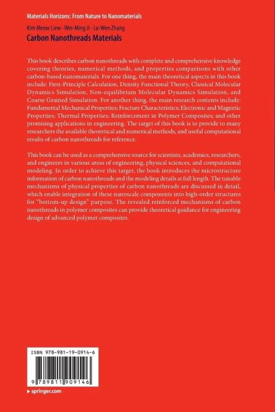 This book describes carbon nanothreads with complete and comprehensive knowledge covering theories, numerical methods, and properties comparisons with other carbon-based nanomaterials. For one thing, the main theoretical aspects in this book include: First-Principle Calculation, Density Functional Theory, Classical Molecular Dynamics Simulation, Non-equilibrium Molecular Dynamics Simulation, and Coarse Grained Simulation. For another thing, the main research contents include: Fundamental Mechanical Properties; Fracture Characteristics; Electronic and Magnetic Properties; Thermal Properties; Reinforcement in Polymer Composites; and other promising applications in engineering. The target of this book is to provide to many researchers the available theoretical and numerical methods, and useful computational results of carbon nanothreads for reference. This book can be used as a comprehensive source for scientists, academics, researchers, and engineers in various areasof engineering,physical sciences, and computational modeling. In order to achieve this target, the book introduces the microstructure information of carbon nanothreads and the modeling details at full length. The tunable mechanisms of physical properties of carbon nanothreads are discussed in detail, which enable integration of these nanoscale components into high-order structures for "bottom-up design" purpose. The revealed reinforced mechanisms of carbon nanothreads in polymer composites can provide theoretical guidance for engineering design of advanced polymer composites.