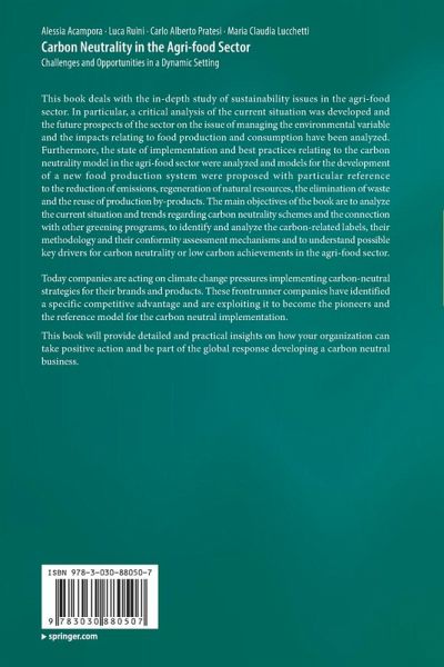This book deals with the in-depth study of sustainability issues in the agri-food sector. In particular, a critical analysis of the current situation was developed and the future prospects of the sector on the issue of managing the environmental variable and the impacts relating to food production and consumption have been analyzed. Furthermore, the state of implementation and best practices relating to the carbon neutrality model in the agri-food sector were analyzed and models for the development of a new food production system were proposed with particular reference to the reduction of emissions, regeneration of natural resources, the elimination of waste and the reuse of production by-products. The main objectives of the book are to analyze the current situation and trends regarding carbon neutrality schemes and the connection with other greening programs, to identify and analyze the carbon-related labels, their methodology and their conformity assessment mechanisms and to understand possible key drivers for carbon neutrality or low carbon achievements in the agri-food sector.