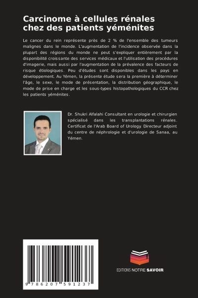 Le cancer du rein représente près de 2 % de l'ensemble des tumeurs malignes dans le monde. L'augmentation de l'incidence observée dans la plupart des régions du monde ne peut s'expliquer entièrement par la disponibilité croissante des services médicaux et l'utilisation des procédures d'imagerie, mais aussi par l'augmentation de la prévalence des facteurs de risque étiologiques. Peu d'études sont disponibles dans les pays en développement. Au Yémen, la présente étude sera la première à déterminer l'âge, le sexe, le mode de présentation, la distribution géographique, le mode de prise en charge et les sous-types histopathologiques du CCR chez les patients yéménites.