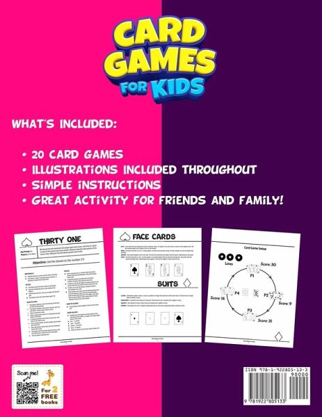 Gather friends and family for quality time with a game night! Learn how to turn a simple deck of cards into hours of fun with Card Games for Kids! Your child will love learning about a variety of card games, including classic favorites like Blackjack or Go Fish. Basic terms are introduced at the beginning of the book and each chapter explains the rules of the game, including objective, set-up, and scoring. Children as young as three years old can learn and enjoy card games. Memorizing the rules of and practicing different games develops multiple cognitive and emotional skills that will benefit your child throughout their entire life: Develops critical thinking skills Improves memory and mental focus Friends and family of all ages can join in the fun. Are you looking for a speed game? Try spit! Do you want to show off your math skills? Play a round of 99! With 20 different card games, there is a game for every interest! Features include: Detailed step-by-step instructions Twentycard games to play All games illustrated to further help kids understand Minimal supplies required Simple to play anywhere Perfect alternative to phones and TVs Great gift idea for birthdays or holidays Start a tradition of game night together with Card Games for Kids Click 'Buy Now' to purchase your very own copy today!