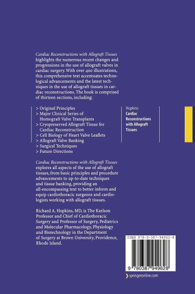 Original Principles.- The Use of Homograft Valves: Historical Perspective.- Major Clinical Series of Homograft Valve Transplants: Left Ventricular Outflow Tract.- Mayo Clinic Series.- University of Alabama at Birmingham Series.- Modified Root Replacement Concept: Influence of Implant Technique on Allograft Durability.- Major Clinical Series of Homograft Valve Transplants: Right Ventricular Outflow Tract.- Great Ormond Street Series.- Denver Series.- Toronto Series.- Cryopreserved Allograft Tissue for Cardiac Reconstruction.- Cryopreserved Cardiac Valves: Initial Experiences and Theories.- Surgery for Infections.- Pulmonary Valve Autotransplant Procedure: Clinical Results Compared with Other Methods for Aortic Valve Replacement.- In Vivo Pulsatile Hemodynamics of Homografts.- Cell Biology of Heart Valve Leaflets.- Leaflet Endothelium.- Leaflet Interstitial Cells.- Leaflet Interstitial Cell Growth and Recovery.- Activation of the Immune System by Cardiac Valve Allografts.- Cryobiology of Heart Valve Preservation.- Application of Cryopreservation to Heart Valves.- Cell Viability and Problems with Its Quantification.- Factors Affecting Cellular Viability During Preimplantation Processing.- Cell Origins and Fates Following Transplantation of Cryopreserved Allografts.- Resolution of the Conflicting Theories of Prolonged Cell Viability.- Allograft Heart Valves: Morphologic, Biochemical, and Explant Pathology Studies.- Overview: Allograft Heart Valves.- Morphology: Allograft Heart Valves.- Biomechanics: Allograft Heart Valves.- Effects of Preimplantation Processing on Allograft Valves.- Explant Pathology Studies.- Implications of Explant Pathology Studies.- Allograft Valve Banking: Harvesting and Cryopreservation Techniques.- Cryopreservation and Tissue Banking.- Donor Suitability and Heart Procurement.- Techniques and Technology: Dissection, Examination, Sterilization, and Cryopreservation.- Techniques and Technology: Storage, Transportation and Distribution, Thawing, Dilution, and Quality Systems.- Surgical Techniques: Valve and Root Methods for Left Ventricular Outflow Tract Reconstructions.- Indications and Contraindications: Valve and Root Methods.- "Freehand" Aortic Valve Replacement with Aortic Allograft Valve Transplant Aortotomy.- The Small Aortic Root: Surgical Techniques for Annulus Enlargement.- Aortoplastic Techniques for Problematic Aortic Root Geometry.- Aortic Root Replacement with Aortic Allograft Conduit.- Aortoventriculoplasty with Aortic Allograft.- "Miniroot" Replacement Techniques.- Stentless Xenograft Valves.- Surgical Techniques: Ross Operation and Variants.- Indications: Ross Operation.- Surgical Anatomy: Ross Operation.- Surgical Technique: Ross Operation.- The Role of Transesophageal Echocardiography During the Ross Procedure.- Guidelines for Use of Aprotinin with the Ross Procedure.- Ross-Konno Procedure.- Methods for Avoiding Technical Errors in Performing the Autograft Pulmonary Valve Transplant.- Surgical Techniques: Complex Reconstructions.- Management of Transposition with Complex Systemic Ventricular Outflow Tract Reconstruction: Rastelli's Operation and Aortic Root Translocation.- Homograft Variant of the Nikaidoh Procedure.- Application of the Principle of Creation of Double Outlet Systemic Ventricle for Hypoplastic Aortic Outflow.- Surgical Techniques: Right Ventricular Outflow Tract Reconstructions.- Indications: Right Ventricular Outflow Reconstructions.- Right Ventricle to Pulmonary Artery Aortic Allograft Conduits in Children and Infants.- Pulmonary Valve Replacement in Adults.- CorrectedTransposition.- Reconstruction of Right Ventricular Outflow with Abnormal Pulmonary Arteries.- Management of Difficult Allograft Alignments: The "Divide and Reapproximate" Principle.- Pulmonary Valve Allografts in Children.- Truncus Arteriosus Repair.- Pulmonary Atresia with MAPCAs: Staged Unifocalization Techniques.- Pulmonary Atresia with MAPCAs: Repairs in Neonates and Young Infants.- Reoperative Right Ventricular Outflow Tract Reconstructions.- Proximal and Distal Extensions.- Reconstruction with Nonvalved Cryopreserved Cardiovascular Tissues.- Extracardiac Fontan Operation.- Future Directions.- FDA Regulatory Policy.- The Biological Valve Spectrum and a Rationale for Prosthetic Valve Choice.- Tissue Engineered Heart Valves: The Next Challenge.