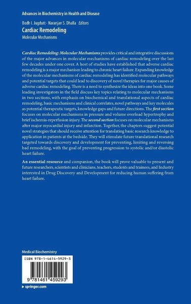 Part I: Molecular mechanisms of remodeling in pressure and volume overload hypertrophy and ehart failure.- beta-adrenergic receptor signaling pathway in heart failure.- Remodeling of potassium channels in cardiac hypertrophy.- Role of gender in Ca2+ cycling and cardiac remodeling due to heart failure.- The failing heart: is it an inefficient engine or an engine out of fuel?.- Regulation of cardiac hypertrophic remodeling by the USP15/SLIM1 pathway.- Role of galectin-3 pathways in the pathogenesis of cardiac remodeling and heart failure.- A mitochondriocentric pathway to cardiomyocyte necrosis: an upstream molecular mechanism in myocardial fibrosis.- The ACE2/Ang (1-7) pathway in cardiac remodeling due to pressure-overload.- Local actions of natriuretic peptides and nitric oxide in cardiac remodelling: Implications for therapy.- Modulating G protein-coupled receptors to effect reverse cardiac remodeling.- Role of inflammation and matrix proteinases in cardiac remodeling following stress and injury.- Role of chymase in matrix and myocardial remodeling due to mitral regurgitation. Implications for therapy.- Cardiac remodeling due to aortic regurgitation and mitral regurgitation.- Reducing oxidative stress and manipulating molecular signaling events using resveratrol as a therapy for pathological cardiac hypertrophy.- Angiogenesis, arteriogenesis, and mitochondrial dysfunction.- Part II: Molecular mechanisms of remodeling after myocardial injury and infarction.- Subcellular remodeling and cardiac dysfunction due to ischemia-reperfusion injury.- Role of microRNAs in cardiac hypertrophy and post-infarction remodeling.- Negative regulators of inflammation as endogenous protective mechanisms in post-infarction remodeling.- TLR-dependent pathways and Akt/mTOR/P70S6K pathways in cardiac remodeling after myocardialinfarction.- The STAT3 pathway and downstream mechanisms in cardiac remodeling: Friend or foe.- The role of growth differentiation factor 5 in cardiac repair post myocardial infarction.- Extracellular matrix biomarkers of adverse remodeling after myocardial infarction.- Oxidative stress in cardiac repair and remodeling: Molecular pathways and therapeutic strategies.- Role of SPARC in cardiac extracellular matrix remodeling after myocardial infarction.- Tissue inhibitor of matrix metalloproteinases in the pathogenesis of heart failure syndromes.- Intracellular matrix remodeling and cardiac function in ischemia-reperfusion injury.- Aging and markers of adverse remodeling after myocardial infarction.- Optimizing stem cell therapy for cardiac repair following a myocardial infarction.- Regulation of fibrosis after myocardial infarction. Implications for ventricular remodeling.- The ACE2/Ang-(1-7) pathway in cardiac fibroblasts as a potential target for cardiac remodeling.
