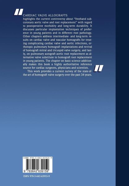 Standards and technical guidelines for heart valve banking.- An international survey of allograft valve banks.- Homograft viability, assessment and significance.- Human heart cold ischemia and its effect on post cryopreservation viability of heart valves.- Effects of storage temperature and fetal calf serum on the endothelium of porcine aortic valves: Functional and microscopic evaluation.- Pre-implantation viability of cryopreserved valves prepared by the Green Lane Technique.- The anatomic and physiological properties of the semilunar valves.- Immunology.- Antigenicity of human cardiac valve allografts in vitro.- Immunology of homograft valves.- Immunogenicity of human cardiac valve allografts.- Immune response and calcification of allografts.- The allograft valve in aortic valve replacement and in transplanted patients.- Allograft conduit wall calcification in a model of chronic arterial graft rejection.- Immunosuppression in allograft valve surgery. A study on inbred rat model.- Allograft Aortic Valve and Root Replacement.- Clinical results of freehand subcoronary aortic valve and root replacement with cryopreserved homografts (allografts).- Results of allograft aortic root replacement in children.- Alternative Procedures Autografts.- Extended aortic root replacement with pulmonary autograft.- Pulmonary autograft: "Valve of choice" for aortic infective endocarditis?.- Treatment of aortic valve endocarditis with the Ross operation.- Techniques of reconstruction of the right ventricular outflow tract at Ross operation.- Infectious Aortic Valve and Thoracic Aorta.- Allograft vs. prosthetic aortic valve replacement for active infective endocarditis.- Allograft aortic root surgery. The infected aortic root.- Cryopreserved aortic homografts for mycotic aneurysms andinfected arterial grafts.- The use of aortic allografts for surgical management of mycotic infections and aneurysms of the thoracic aorta.- Large-caliber arterial allografts.- Aortic and Pulmonary Allografts for Reconstruction of the Right Ventricular Outflow Tract (Orthotopic and Heterotopic Implantation).- Allograft reconstruction of the right ventricular outflow tract: Techniques and results.- Outcome of pulmonary and aortic allografts for reconstruction of the right ventricular outflow tract in congenital cardiac surgery.- Long-term results of allograft conduits in the pulmonary circulation.- Techniques for repair of tetralogy of Fallot with pulmonary atresia using homografts - The Rotterdam Experience.- Use of allografts in the primary repair of Truncus arteriosus in early infancy and replacement of previous conduits revisited.- Orthotopic and heterotopic implantation of cryopreserved semilunar valves in the pulmonary circulation.- Intermediate-term performance of CryoLife cryopreserved heart valve allografts.- Homograft Mitral and Tricuspid Valve Replacement.- Replacement of the mitral and tricuspid valves with aortic and pulmonary valve allografts.- Mitral valve homograft.- Mitral valve allgrafts with mitral position.- Immunology and fate of mitral allografts. What are the operative technical options and prerequisites for durability?.- Unstented live tricuspid and mitral valve allografts.- Concluding Remarks and Prospects.