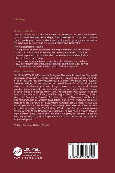 Part I - Introduction. Chapter 1: Advances in Cardiovascular Toxicology. Chapter 2: Pathobiology of Myocardial Ischemic Injury. Part II - Methods. Chapter 3: Nonclinical Safety Assessment of the Cardiovascular Toxicity of Drugs and Combination Medical Devices. Chapter 4: Novel Approaches in the Evaluation of Cardiovascular Toxicity. Chapter 5: Cardiovascular Dynamics in Conscious Primates. Part III - Cardiotoxicity. Chapter 6: Cardiovascular Toxicity of Antimicrobials. Chapter 7: Cardiotoxicity of Anthracyclines and Other Antineoplastic Agents. Chapter 8: Catecholamine-induced Cardiomyopathy. Chapter 9: Adverse Effects of Centrally Acting Drugs on the Cardiovascular System. Chapter 10: Adverse Effects of Drugs on Electrophysiological Properties of the Heart. Chapter 11: Cardiovascular Effects of Steroidal Agents. Chapter 12: Cardiotoxicity of Industrial Chemicals and Environmental Pollutants. Chapter 13: Adverse Effects of Cigarette Smoking on the Cardiovascular System. Part IV - Vascular Toxicity. Chapter 14: Overview of Vascular Toxicology. Chapter 15: Pathobiology of the Vascular Response to Injury. Chapter 16: The Arterial Media as a Target of Injury by Chemicals.