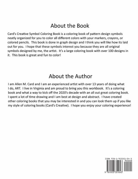 Card's Creative Symbol Coloring Book is a coloring book of pattern design symbols neatly organized for you to color all different colors with your markers, crayons, or colored pencils. This book is done in graph design and I think you will like how its laid out for you. I hope that these symbols interest you because they are all original symbols designed by me, the artist. It's a large coloring book with over 100 designs in it. This book is great and fun to color! I am Allen M. Card and I am an experienced artist with over 13 years of doing what I do, ART. I live in Virginia and am proud to bring you this workbook. It's a coloring book and what a way to kick off the 2020's decade with an all out great coloring book. I spent a lot of time drawing and I am best at design and abstract. I have created other coloring books that you may be interested in and you can look them up if you like my style of coloring books (Card's Creative). I hope you enjoy your coloring experience!