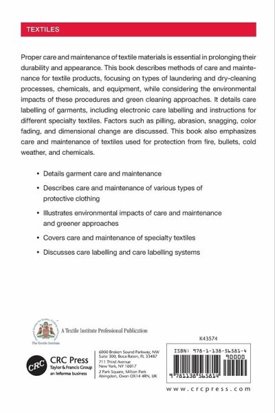 Proper care and maintenance of textile materials is essential in prolonging their durability and appearance. This books describes methods of care and maintenance for textile products, focusing on types of laundering and dry-cleaning processes, chemicals, and equipment, while considering the environmental impacts of these procedures and green cleaning approaches. It details care labelling of garments, including electronic care labelling and instructions for different specialty textiles. Factors such as pilling, abrasion, snagging, color fading, and dimensional change are discussed. This book also emphasizes care and maintenance of textiles used for protection from fire, bullets, cold weather, and chemicals.