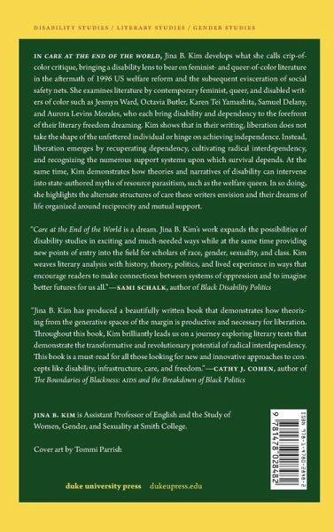 In Care at the End of the World, Jina B. Kim develops what she calls crip-of-color critique, bringing a disability lens to bear on feminist- and queer-of-color literature in the aftermath of 1996 US welfare reform and the subsequent evisceration of social safety nets. She examines literature by contemporary feminist, queer, and disabled writers of color such as Jesmyn Ward, Octavia Butler, Karen Tei Yamashita, Samuel Delany, and Aurora Levins Morales, who each bring disability and dependency to the forefront of their literary freedom dreaming. Kim shows that in their writing, liberation does not take the shape of the unfettered individual or hinge on achieving independence. Instead, liberation emerges by recuperating dependency, cultivating radical interdependency, and recognizing the numerous support systems upon which survival depends. At the same time, Kim demonstrates how theories and narratives of disability can intervene into state-authored myths of resource parasitism, such as the welfare queen. In so doing, she highlights the alternate structures of care these writers envision and their dreams of life organized around reciprocity and mutual support.
