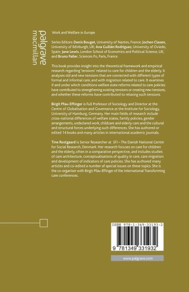 Tensions Related to Care in European Welfare States; B.Pfau-Effinger & T.Rostgaard Theorising Care and Care Work; A.Anttonen & M.Zechner Tensions between Care Values and Care Policies in European Societies; B.Pfau-Effinger Tensions in Family Policies in Post-Communist Central Europe; S.Saxonberg Nordic Child Care - a Response to Old and New Tensions?; G.Eydal & T.Rostgaard Tensions Related to the Transition of Elderly Care from an Unpaid to a Paid Activity; P.H.Jensen & R.Juul Møberg Under Tension: Formal Care Work with Older People; T.Kröger Tensions Related to Care Migration - The South-North Divide of Long Term Care; T.Rostgaard, C.Chiatti & G.Lamura Migrant Carers in Eldercare Provision: Interaction of Policy Fields; H.Theobald Tensions Related to Cash for Care Schemes; B.Da Roit & B.Le Bihan