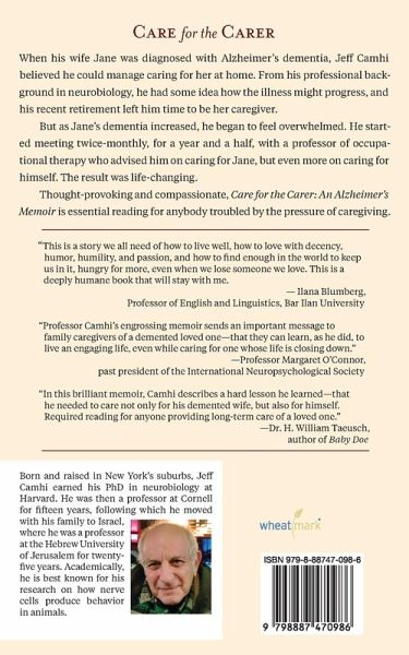 When his wife Jane was diagnosed with Alzheimer's dementia, Jeff Camhi believed he could manage caring for her at home. From his professional background in neurobiology, he had some idea how the illness might progress, and his recent retirement left him time to be her caregiver. But as Jane's dementia increased, he began to feel overwhelmed. He started meeting twice-monthly, for a year and a half, with a professor of occupational therapy who advised him on caring for Jane, but even more on caring for himself. The result was life-changing. Thought-provoking and compassionate, Care for the Carer: An Alzheimer's Memoir is essential reading for anybody troubled by the pressure of caregiving.