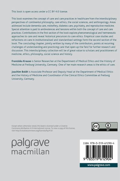 This book examines the concept of care and care practices in healthcare from the interdisciplinary perspectives of continental philosophy, care ethics, the social sciences, and anthropology. Areas addressed include dementia care, midwifery, diabetes care, psychiatry, and reproductive medicine. Special attention is paid to ambivalences and tensions within both the concept of care and care practices. Contributions in the first section of the book explore phenomenological and hermeneutic approaches to care and reveal historical precursors to care ethics. Empirical case studies and reflections on care in institutionalised and standardised settings form the second section of the book. The concluding chapter, jointly written by many of the contributors, points at recurring challenges of understanding and practicing care that open up the field for further research and discussion. This collection will be of great value to scholars and practitioners of medicine, ethics, philosophy, social science and history.