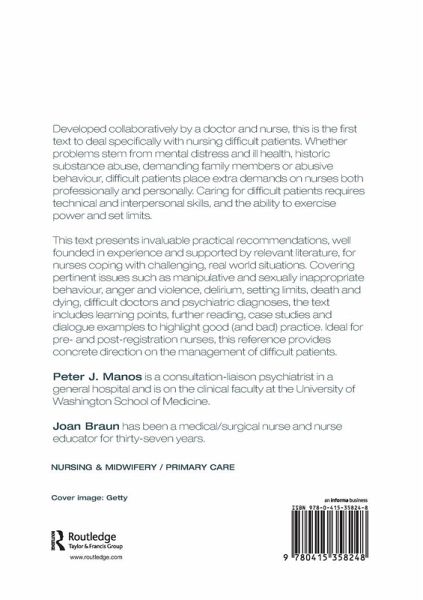 Developed collaboratively by a doctor and nurse team, this textbook deals specifically with nursing difficult patients. It gives invaluable practical recommendations, well founded in experience and supported by literature for nurses coping with challenging, real world situations.