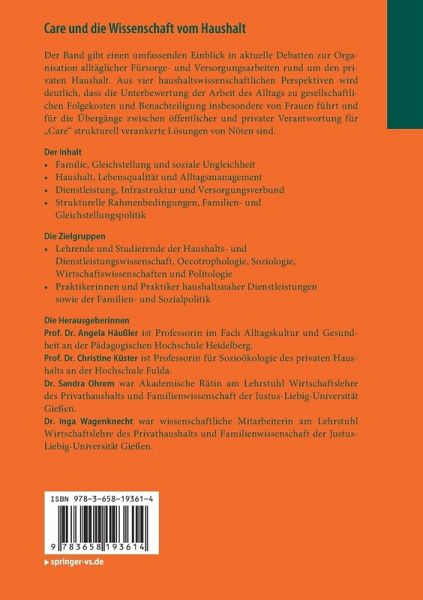 Der Band gibt einen umfassenden Einblick in aktuelle Debatten zur Organisation alltäglicher Fürsorge- und Versorgungsarbeiten rund um den privaten Haushalt. Aus vier haushaltswissenschaftlichen Perspektiven wird deutlich, dass die Unterbewertung der Arbeit des Alltags zu gesellschaftlichen Folgekosten und Benachteiligung insbesondere von Frauen führt und für die Übergänge zwischen öffentlicher und privater Verantwortung für "Care" strukturell verankerte Lösungen von Nöten sind.