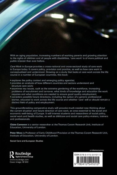 Care Work in Europe provides a cross-national and cross-sectoral study of care work in Europe today, covering policy, provision and practice, as well as exploring how care work is conceptualized and understood. Drawing on a study which looks at care work across the life course in a number of European countries, this book: explores the context and emerging policy agendas provides an analysis of how different countries and sectors understand and structure care work examines key issues, such as the extreme gendering of the workforce, increasing problems of recruitment and turnover, what kinds of knowledge and education the work requires and what conditions are needed to ensure good quality employment considers possible future directions, including the option of a generic professional worker, educated to work across the life course and whether 'care' will, or should, remain a distinct field of policy and employment. This groundbreaking comparative study provokes much-needed new thinking about the current situation and future direction of care work, an area essential to the social and economic well-being of Europe.