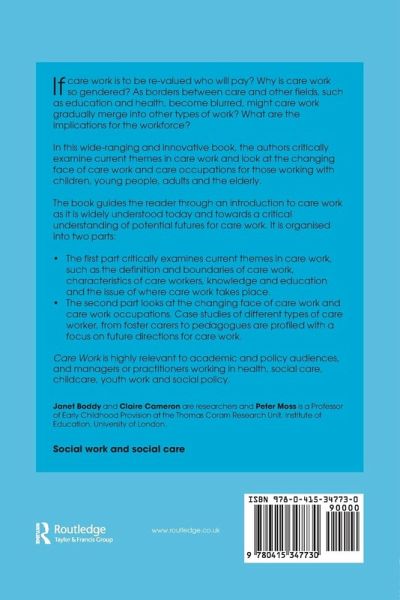 Care Work considers the current situation of care work and care workers, from childcare to eldercare, and from family carers to paid carers. It examines the composition of the current workforce (more than a million in the UK alone), the knowledge and education needed for care work, and the significance of where care work is undertaken (in the home, in institutions). Considering potential challenges and scenarios, the book poses big questions about the future of care work - offering some possible answers. Wide-ranging and innovative, Care Work will be of great interest to academic and policy audiences, and managers or practitioners working in health, social care, childcare, youth work and social policy.