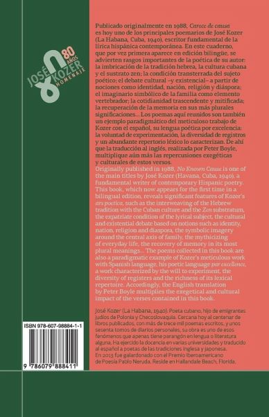 Publicado originalmente en 1988, Carece de causa es hoy uno de los principales poemarios de José Kozer (La Habana, Cuba, 1940), escritor fundamental de la lírica hispánica contemporánea. En este cuaderno, que por vez primera aparece en edición bilingüe, se advierten rasgos importantes de la poética de su autor: la imbricación de la tradición hebrea, la cultura cubana y el sustrato zen; la condición transterrada del sujeto poético; el debate cultural –y existencial– a partir de nociones como identidad, nación, religión y diáspora; el imaginario simbólico de la familia como elemento vertebrador; la cotidianidad trascendente y mitificada; la recuperación de la memoria en sus más plurales significaciones… Los poemas aquí reunidos son también un ejemplo paradigmático del meticuloso trabajo de Kozer con el español, su lengua poética por excelencia: la voluntad de experimentación, la diversidad de registros y un abundante repertorio léxico lo caracterizan. De ahí que la traducción al inglés, realizada por Peter Boyle, multiplique aún más las repercusiones exegéticas y culturales de estos versos. Originally published in 1988, No Known Cause is one of the main titles by José Kozer (Havana, Cuba, 1940), a fundamental writer of contemporary Hispanic poetry. This book, which now appears for the first time in a bilingual edition, reveals significant features of Kozer’s ars poetica, such as the interweaving of the Hebrew tradition with the Cuban culture and the Zen substratum, the expatriate condition of the lyrical subject, the cultural and existential debate based on notions such as identity, nation, religion and diaspora, the symbolic imagery around the central axis of family, the mythicizing of everyday life, the recovery of memory in its most plural meanings... The poems collected in this book are also a paradigmatic example of Kozer’s meticulous work with Spanish language, his poetic language par excellence, a work characterized by the will to experiment, the diversity of registers and the richness of its lexical repertoire. Accordingly, the English translation by Peter Boyle multiplies the exegetical and cultural impact of the verses contained in this book.