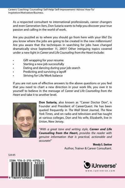 As a respected consultant to international professionals, career changers and even Generation Xers, Don Sutaria wants to help you discover your true passion and calling in the world of work. Are you puzzled as to where you should go from here with your life? Do you know where the jobs are going to be created in the new millennium? Are you aware that the techniques in searching for jobs have changed dramatically since September 11, 2001? Other intriguing topics covered under a new light in Career and Life Counseling from the Heart include: -Gift wrapping for your resume -Starting a new job successfully -Dating and dancing during your job search -Predicting and surviving a layoff -Striving for Life/Work balance If you are not sure of effective answers to the above questions or you feel that you need to chart a new direction in your work life, you owe it to yourself to believe in the message of Career and Life Counseling from the Heart and take it to another level. If you are not sure of effective answers to the above questions, you owe it to yourself to buy and read this book today! Other intriguing topics covered under a new light are: Professional Friendship Development (a k a Networking), the Internet as your Servant, Image Consulting and On-Camera Feedback, the Gift Wrapping for your Resume (Cover Letter), Career Assessment and Career Change, a Personal Marketing Campaign, Salary Negotiations, Transition from School or College to Work, Job Interviews, Starting a New Job Successfully, Finding Jobs after Age 50, Working with Generation X and Generation Y, Striving for Life/Work Balance, Dating and Dancing During Job Search, Tips for Immigrant Professionals, Predicting and Surviving a Layoff, Success Path after a Career-Related Failure, Office Politics, Spirituality and Career Counseling, Cultural Diversity in the Workforce, and many other contemporary topics.