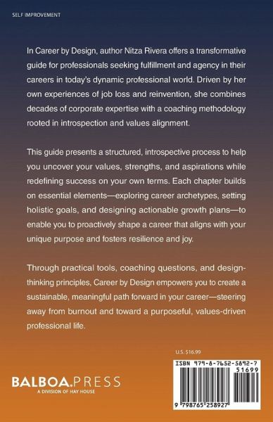In Career by Design, author Nitza Rivera offers a transformative guide for professionals seeking fulfillment and agency in their careers in today's dynamic professional world. Driven by her own experiences of job loss and reinvention, she combines decades of corporate expertise with a coaching methodology rooted in introspection and values alignment. This guide presents a structured, introspective process to help you uncover your values, strengths, and aspirations while redefining success on your own terms. Each chapter builds on essential elements-exploring career archetypes, setting holistic goals, and designing actionable growth plans-to enable you to proactively shape a career that aligns with your unique purpose and fosters resilience and joy. Through practical tools, coaching questions, and design-thinking principles, Career by Design empowers you to create a sustainable, meaningful path forward in your career-steering away from burnout and toward a purposeful, values-driven professional life.