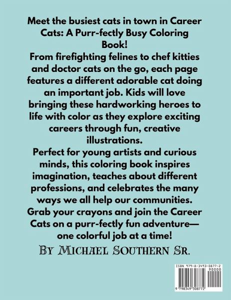 Career Cats: A Purr-fectly Busy Coloring Book - Meet the Hardworking Cats with Jobs That Inspire and Delight! Get ready to explore the world of work-cat style! Career Cats is a fun and imaginative coloring book where every page features an adorable cat dressed for a different job. From brave firefighter felines and helpful police kitties to clever chefs, caring doctors, skilled plumbers, and more, these purr-fect professionals are here to entertain and inspire young minds. With playful illustrations and a wide variety of careers to discover, this coloring book is perfect for curious kids who love animals, creativity, and dreaming big.