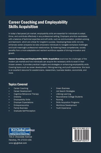 In today's fast-paced job market, employability skills are essential for individuals to adapt, thrive, and contribute effectively in any professional setting. Employers prioritize candidates with a balance of technical expertise and soft skills, such as communication, problem-solving, and teamwork, which are critical for long-term success. Developing these skills not only enhances career prospects but also empowers individuals to navigate workplace challenges and build meaningful professional relationships. By fostering these competencies, society benefits from a more adaptable and resilient workforce capable of driving innovation and growth. Career Coaching and Employability Skills Acquisition examines the challenges of the modern job market and how individuals can acquire the necessary skills to excel in their chosen careers. It provides practical insights and strategies on enhancing employability skills. Covering topics such as career development, lifelong learning, and youth experience, this book is an excellent resource for academicians, researchers, business leaders, economists, and more.