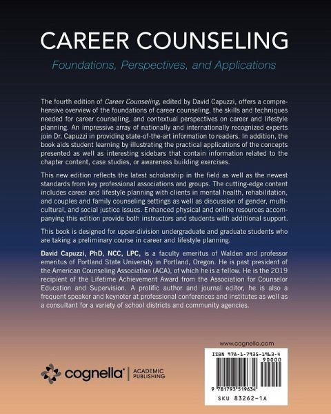 The fourth edition of Career Counseling, edited by David Capuzzi, offers a comprehensive overview of the foundations of career counseling, the skills and techniques needed for career counseling, and contextual perspectives on career and lifestyle planning. An impressive array of nationally and internationally recognized experts join Dr. Capuzzi in providing state-of-the-art information to readers. In addition, the book aids student learning by illustrating the practical applications of the concepts presented as well as interesting sidebars that contain information related to the chapter content, case studies, or awareness building exercises. This new edition reflects the latest scholarship in the field as well as the newest standards from key professional associations and groups. The cutting-edge content includes career and lifestyle planning with clients in mental health, rehabilitation, and couples and family counseling settings as well as discussion of gender, multicultural, and social justice issues. Enhanced physical and online resources accompanying this edition provide both instructors and students with additional support. This book is designed for upper-division undergraduate and graduate students who are taking a preliminary course in career and lifestyle planning.