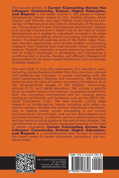 This second edition of Career Counseling Across the Lifespan: Community, School, Higher Education, and Beyond is the latest volume in the Issues in Career Development Series, edited by Drs. Grafton Eliason, Mark Lepore, Jeff Samide, and John Patrick, from California University of Pennsylvania and Clarion University of Pennsylvania. The purpose of Career Development Across the Lifespan is to provide a broad and in-depth look at the field of career development as it applies to individuals involved in all areas of community counseling, school counseling, and higher education. The book will examine some of the field's major theories, themes, approaches, and newest models incorporating chapters from national and international career counseling experts. Specific emphasis is spent examining issues reflective of today's challenges in developing and maintaining a workforce that is diverse, flexible, and efficient. Readers will be provided with an action-based framework built on the best available research. This text book is truly the culmination of a decade’s work, compiling comprehensive studies from four previous volumes and updating key concepts in career counseling with the most contemporary theories and innovations. We examine three primary domains of career counseling throughout all of the developmental stages of the lifespan: community, schools K-12, and higher education. We include a specific focus on career history and theories, to prepare students for both the counseling environment and for national exams leading to certification and licensure, such as the (NCE) National Counseling Exam. We also include cutting edge research on contemporary topics, including such areas as: military careers, life after the military, individuals with disabilities or special needs, career counseling in our current socio-economic environment, and current technologies such as virtual counseling. In addition, we have added case studies and key terms as study guides at the end of each chapter. We are fortunate to include many recognized experts in the field of career counseling. Career Counseling Across the Lifespan: Community, School, Higher Education, and Beyond is a comprehensive text, written to address the broad needs of career counselors, educators, and students today.