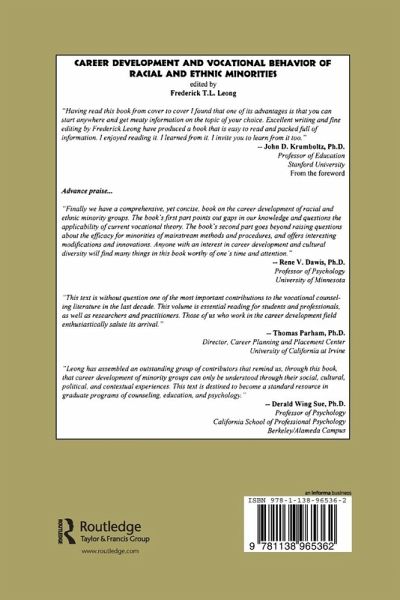 Contents: J.D. Krumboltz Foreword. F.T.L. Leong Introduction and Overview. Part I:Theory and Research.M.T. Brown The Career Development of African Americans: Theoretical and Empirical Issues. C. Arbona Theory and Research on Racial and Ethnic Minorities: Hispanic Americans. F.T.L. Leong F.C. Serafica Career Development of Asian Americans: A Research Area in Need of a Good Theory. M.J. Johnson J.L. Swartz W.E. Martin Jr. Applications of Psychological Theories for Career Development With Native Americans. Part II:Assessment and Intervention.S.L. Bowman Career Intervention Strategies and Assessment Issues for African Americans. N.A. Fouad Career Behavior of Hispanics: Assessment and Career Intervention. F.T.L. Leong R.H. Gim-Chung Career Assessment and Invervention With Asian Americans. W.E. Martin Jr. Career Development Assessment and Intervention Strategies With American Indians. Part III:Future Directions.S.H. Osipow E.M. Littlejohn Toward a Multicultural Theory of Career Development: Prospects and Dilemmas. N.E. Betz L.F. Fitzgerald Career Assessment and Intervention With Racial and Ethnic Minorities.
